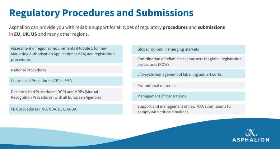 Asphalion can provide you with reliable support for all types of regulatory procedures and submissions in EU, UK, US and many other regions. We have 20+ years of track record with New Chemical Entities, Biologicals, ATMPs, Orphan Drugs, Generics, OTCs, Herbal Medicines, among others. We can coordinate your submissions, liaise with agencies and solve all potential hurdles, making sure to comply with critical timelines and reducing the time to market. We offer flexible options for support in the submission process, including submission planning, coordination and execution.